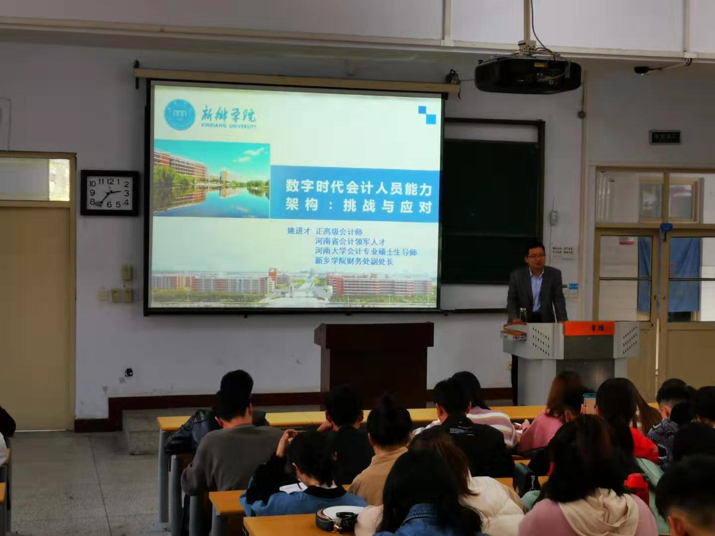 2019年11月12日下午14:30,2138CC太阳集团邀请财务处姚进才副处长在A11-119举办了以“数字时代会计人员的能力架构:挑战与应对”为主题的专题讲座,由2138CC太阳集团副院长张磊主持。2138CC太阳集团2017级和2018级会计专业学生聆听了本次讲座。