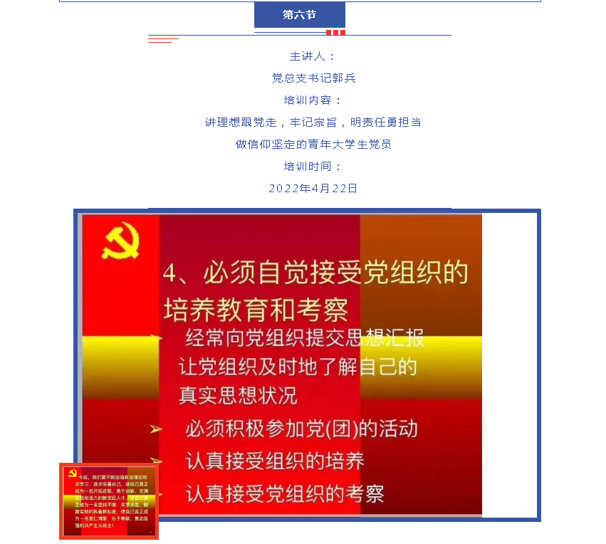 党总支书记郭兵老师介绍了发展党员工作步骤和要求,分析学生中的入党动机分为信仰型、现实型、模糊型和投机型。端正入党动机的原因和端正入党动机。必须树立为实现共产主义奋斗终身的信念、必须树立全心全意为广大人民谋利益的思想、必须在工作、学习和生活中起先锋模范作用,必须自觉接受党组织的培养教育和考察。对同学们提出希望和要求。