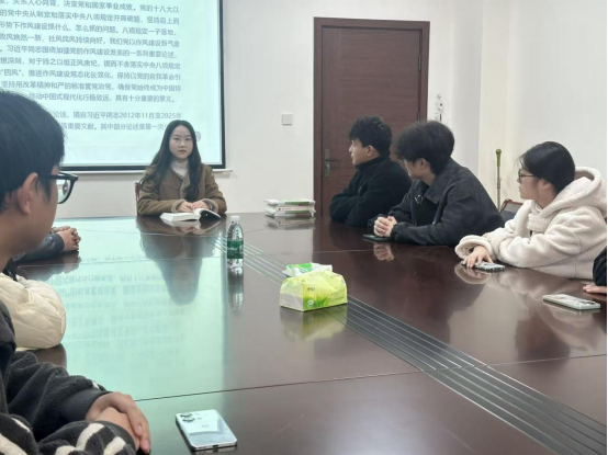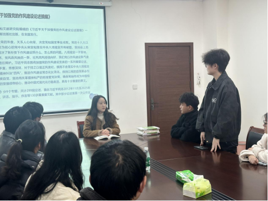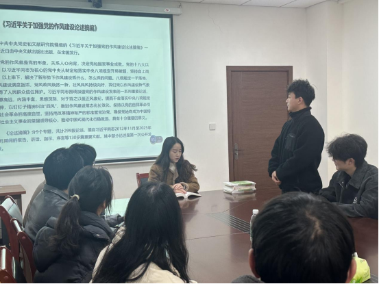 随后,郭纹宇同志领学《习近平关于加强党的作风建设论述摘编》,结合实际,深入解读中央八项规定精神。通过生动案例,阐述中央八项规定精神对党员个人成长、党组织建设以及社会风气改善的重要意义,引导学生党员深入思考,如何将这一精神内化于心、外化于行,真正体现在日常学习、生活和工作中。