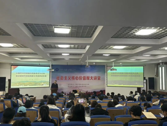 严珉老师以《中国特色社会主义民族宗教理论知识》为主题,以“团结是民族复兴的基石”为核心,用一个个鲜活生动的案例,解读新时代党的民族工作的重大意义与实践路径。从脱贫攻坚中各民族互帮互助、携手共进的感人故事,到疫情防控里各族人民同心同德、共克时艰的责任担当;从文化传承中各民族文化交相辉映、融合发展的生动实践,到日常校园里不同民族同学同窗共读、友爱相处的温暖瞬间。严珉老师的讲解既有理论高度,又有生活温度,让“中华民族共同体意识”从抽象的政治概念,变成了可感可知、可学可做的行动指南。