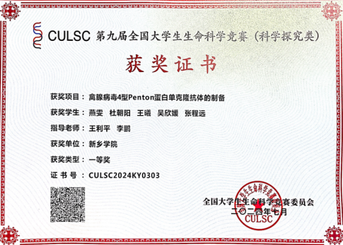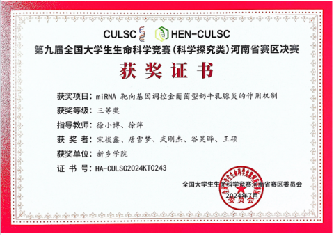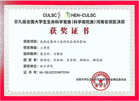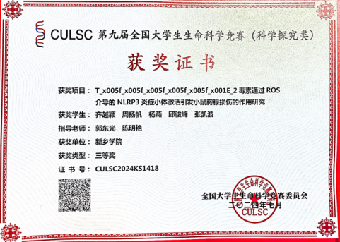 第九届全国大学生生命科学竞赛(科学探究类)河南省三等奖