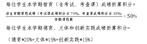 综合素质测评考核办法按照我院学生日常管理工作每学期汇总、核算一次,分为德育、智育、文体、创新实践素质成绩四个方面,每位学生的总折算积分=该生本学期智育(含考试、考查课)成绩折算积分+德育、文体和创新实践成绩折算积分,总折算积分最高为100分,其中智育成绩积分占50%(计算课程成绩原始分时,考试课成绩积分占70%,考查课成绩积分占30%),德育、文体和创新实践成绩积分占20%、15%和15%。